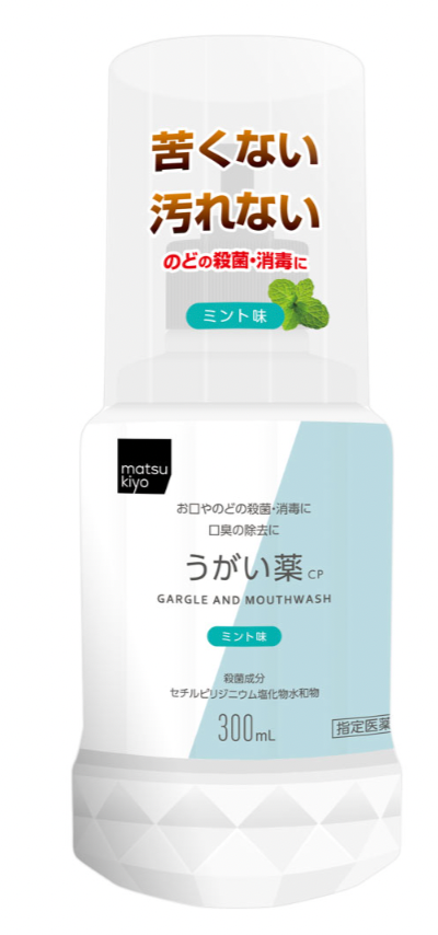 松本清出品的 matsukiyo 消炎漱口水CP薄荷味 300ml為其中一款含有殺菌劑Cetylpyridinium chloride(CPC),以及dipotassium glycyrrhizatew(甘草酸二鉀)成份的漱口水