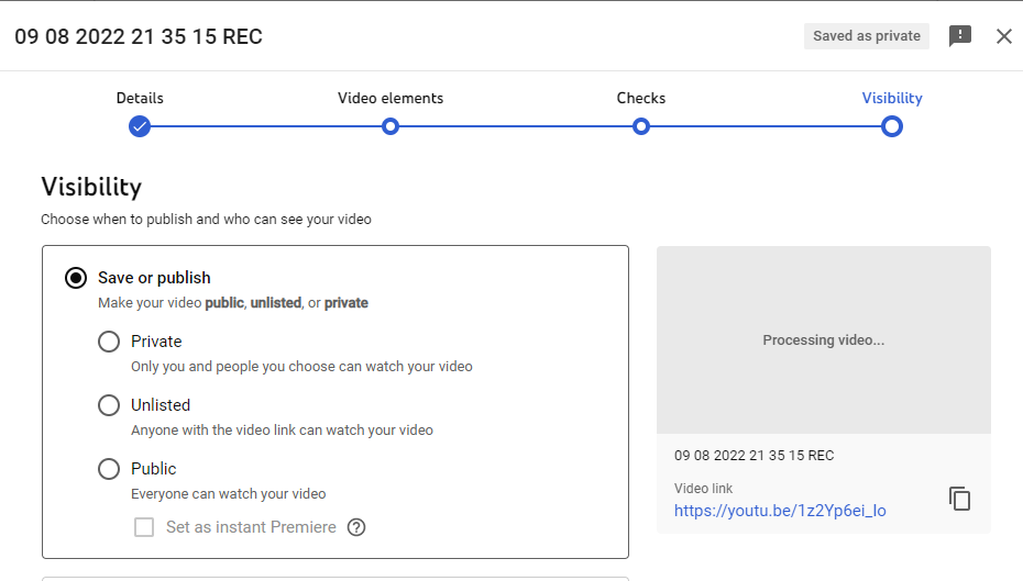 5) 根據需要揀選”Visibility”,揀選”Unlisted”以保障個人私隱,只有連結的人可以看你的影片。