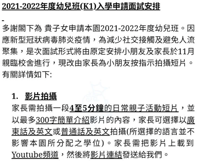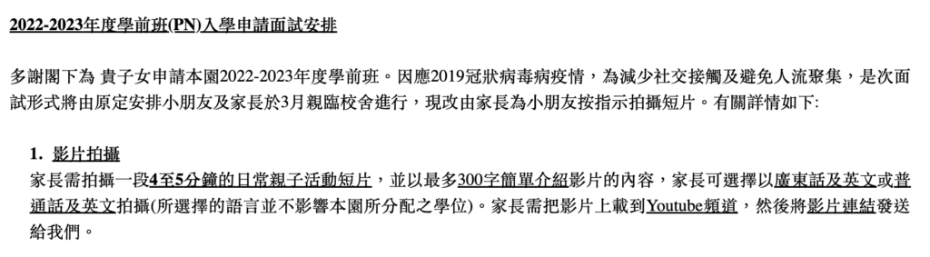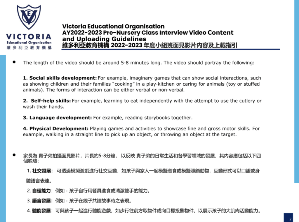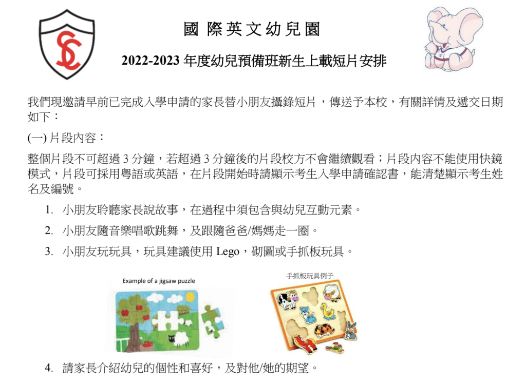 St Catherine 幼稚園K1在2022-2023的面試拍片要求非常仔細,除了考驗家長能否要求小朋友坐定定做好以下的內容,亦需要精準地構思如何在短短十數秒內將小朋友的能力濃縮呈現出來。