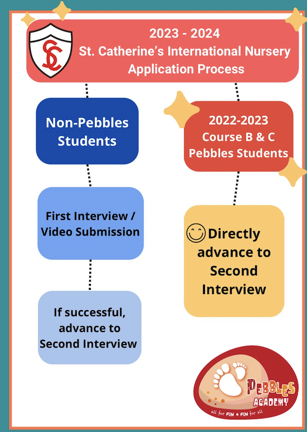 St Catherine 2023-2024年的N班面試安排已有初步公布,安排與去年只得一輪拍片定生死不同。常常有家長問,到底讀Pebbles (St Catherine姊妹playgroup)對入讀St Catherine有沒有幫助?今年Pebbles的公布明確表示,報讀Course B & C的Pebbles學生可以直入Second-in而毋須交片,沒有報讀Pebbles的申請人則需要交第一輪面試片段,經篩選後再進行Second-in。