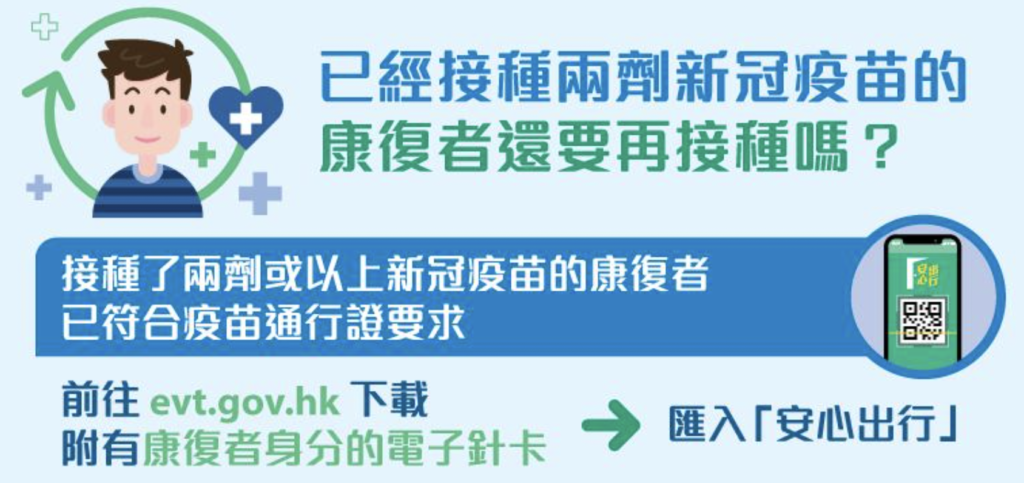 康復者可透過「醫健通」APP或電子疫苗接種及檢測紀錄系統 http://www.evt.gov.hk 重新下載帶有康復身分的疫苗接種紀錄QR Code,並在安心出行應用程式內更新新的QR Code,便可繼續符合疫苗通行證的要求。