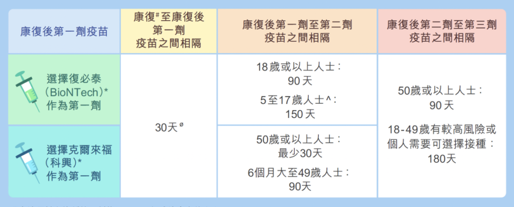 根據衛生署建議,康復後至少應相隔30天,才接種第一劑疫苗,詳細建議可參考下圖: