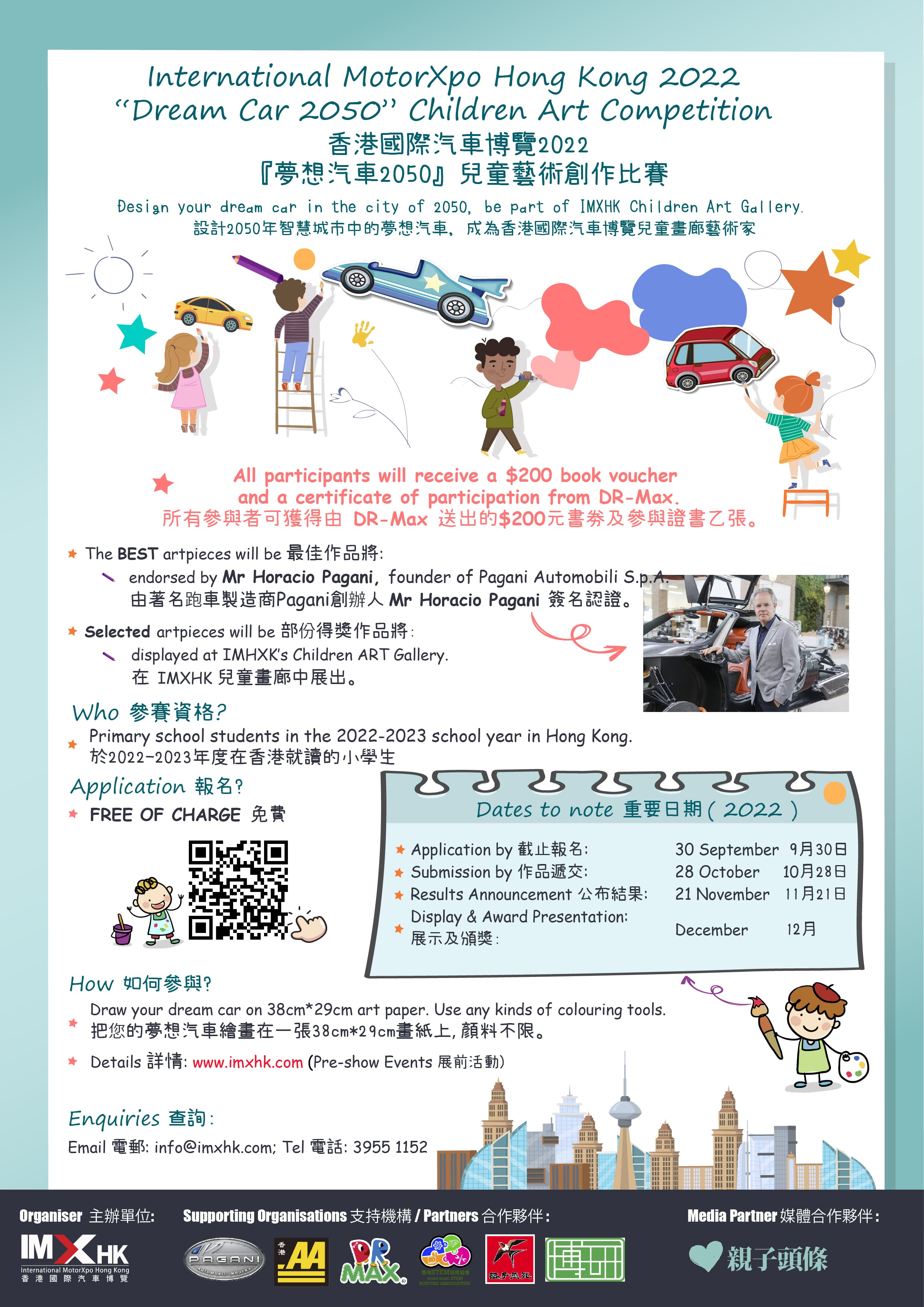 是次活動的所有參與者亦可獲得由 DR-Max 提供的 HK$200 書劵及參與證書乙張。參加者只需在自備的38cm x 29cm 白色畫紙上繪畫出心目中的2050年夢想汽車,並於2022年10月28日或之前,親身遞交或郵寄至指定收集點便可。