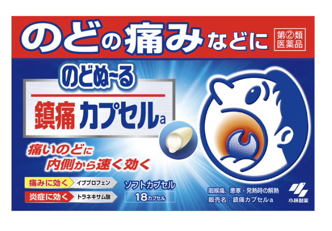 小林製藥的喉嚨鎮痛膠囊含有布洛芬及氨甲環酸,布洛芬是一種鎮痛成分,可快速舒緩喉嚨痛楚,而氨甲環酸亦含有抗炎成分,有助緩解發炎患處。這款鎮痛膠囊亦有助退燒,屬第二類醫藥品,連稅官方售價為1,078円,同樣在各大藥妝及網店有售。。