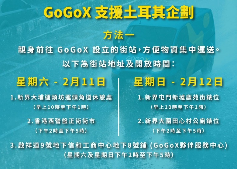 有心捐贈者亦可以透過GOGOX應用程式以優惠碼「HELPTURKEY」落單,送至觀塘啟祥道9號地下信和工商中心地下8號鋪的GOGOX夥伴服務中心,GOGOX將津貼一半運費,上限為每單50元。