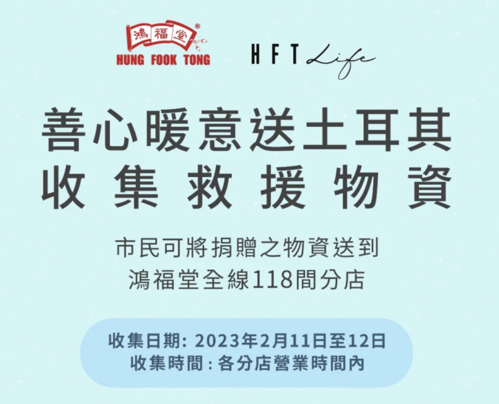 鴻福堂於2月11至12日開放全線118間分店收集市民捐贈的物資,並於2月13日傍晚前將物資運送到領事館指定的葵涌物流貨倉。