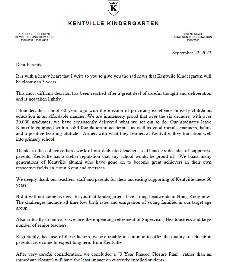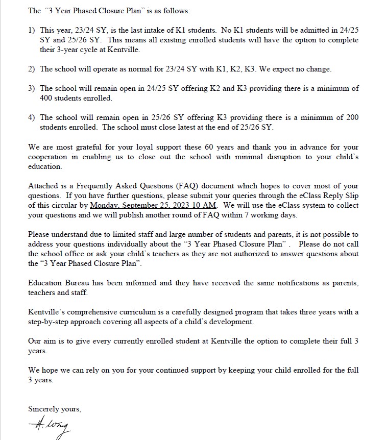 - 24/25學年,如果有至少400名學生入讀,學校將繼續提供K2和K3課程。