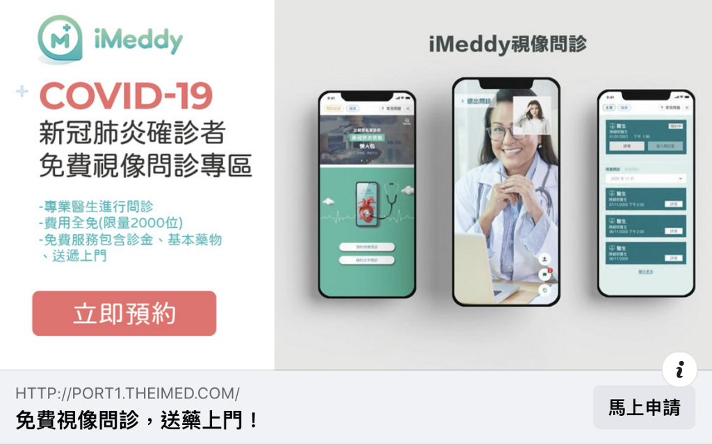 線上醫療平台iMeddy聯合多位香港私家醫生向新冠肺炎確診者、初步確診者提供免費診症服務,問診服務會以視像形式進行,並會於問診後安排送遞服務,提供基本藥物如退燒止痛藥、抗生素、醫療物資支援確診者。