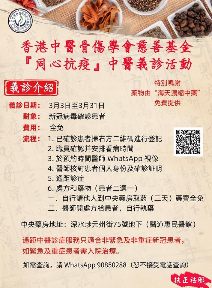 為舒緩公院壓力,香港中醫骨傷學會慈善基金「同心抗疫」中醫義診活動明日(3日)起舉辦,為新冠病毒確診患者提供線上視像義診服務,並會免費送治療藥物,病人可派人到診所代領中藥。