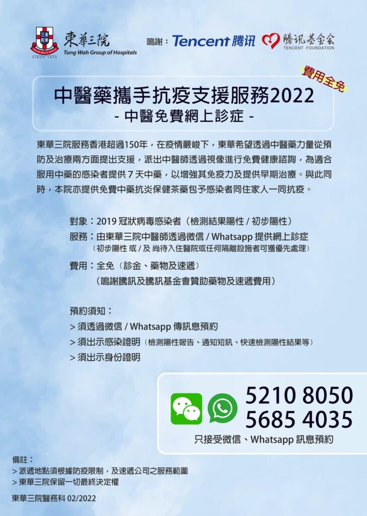 東華三院表示,在疫情嚴峻下,希望透過中醫藥力量從預防及治療兩方面提供支援,派出中醫師透過視像進行免費健康諮詢,為適合服用中藥的感染者提供7天中藥,以增強其免疫力及提供早期治療。