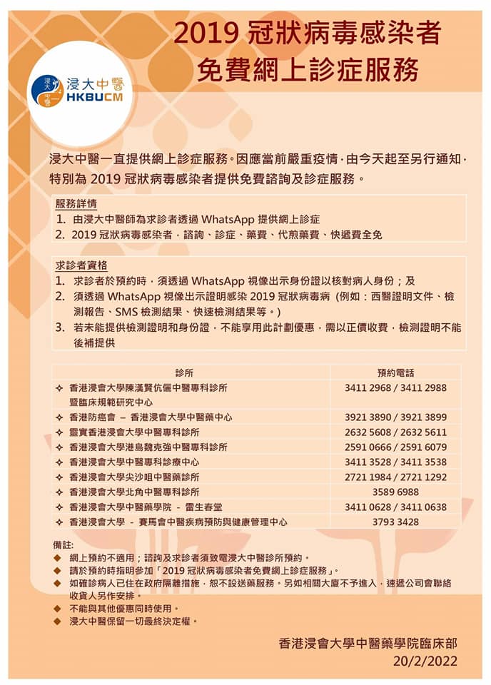 浸大中醫因應當前嚴重疫情,由2月20日起至另行通知特別為2019冠狀病毒感染者提供免費諮詢服及診症服務