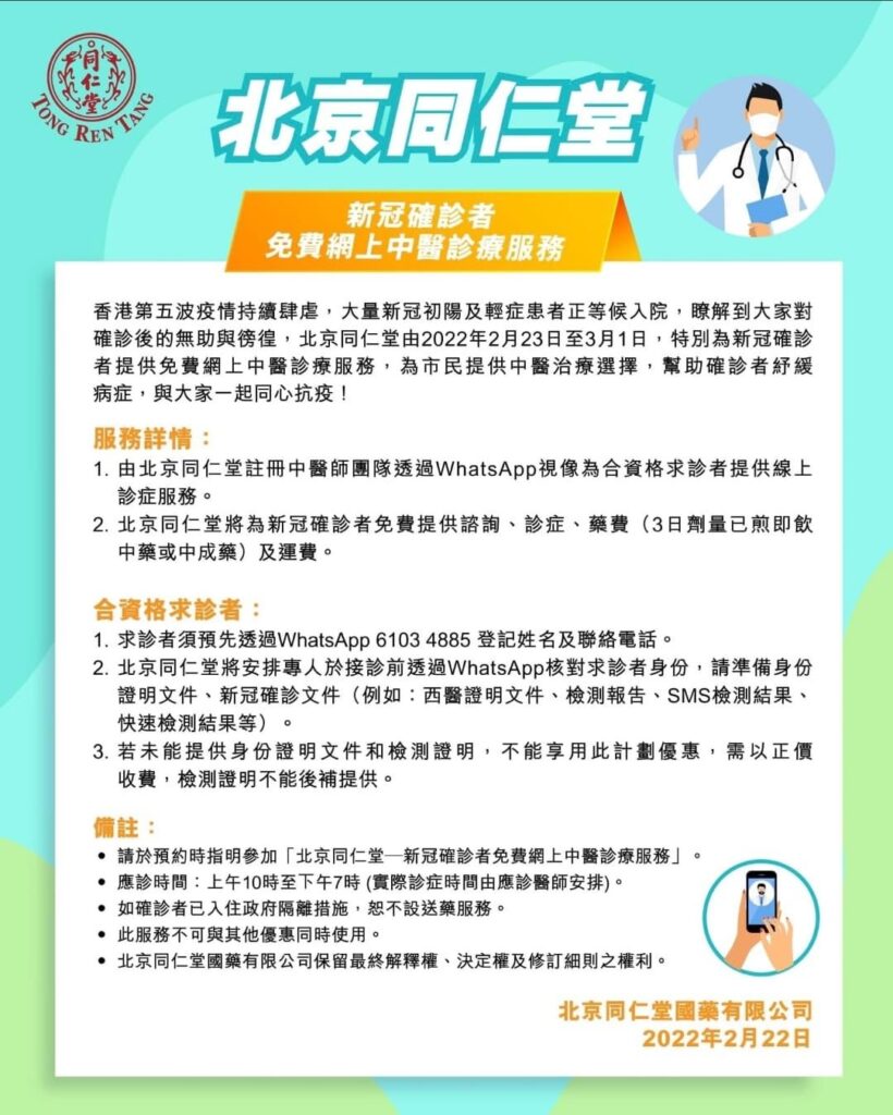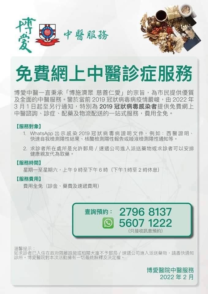 博愛中醫由2022年3月1日起至另行通知,特別為2019冠狀病毒感染者提供免費網上中醫諮詢、診症、配藥及物流配送的服務,費用全免