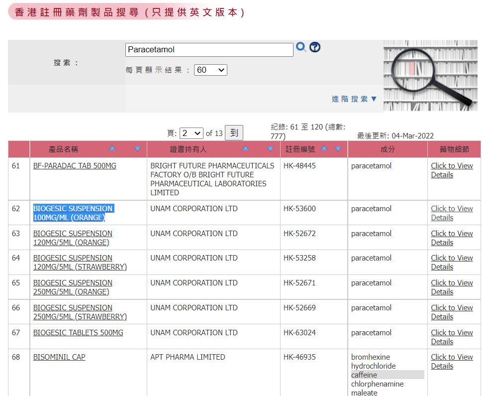 撲熱息痛(Paracetamol)可用於止痛及退燒,根據紀錄,本港現時有777個已註冊的藥劑製品含有撲熱息痛成份。巿民可於衞生署藥物辦公室網頁利用「香港註冊藥劑製品搜尋」功能,以產品的英文名稱或成份,搜尋有關已註冊藥劑製品的資料。